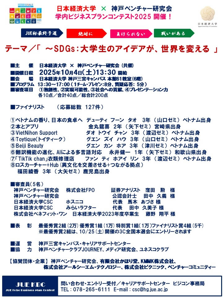 10月は日本経済大学と神戸ベンチャー研究会との共催で、日本経済大学神戸三宮キャンパスに在籍している学生を対象にしたビジネスプランコンテスト「学内ビジネスプランコンテスト2025」の最終選考会を開催します。
